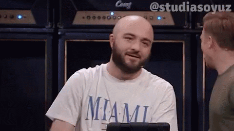 Bald man in Miami t-shirt makes rap-like hand gestures on Studia Soyuz.
