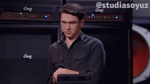 Comedian Nurlan Saburov on stage, saying 'Okay, fine, that's it!' in front of guitar amps.