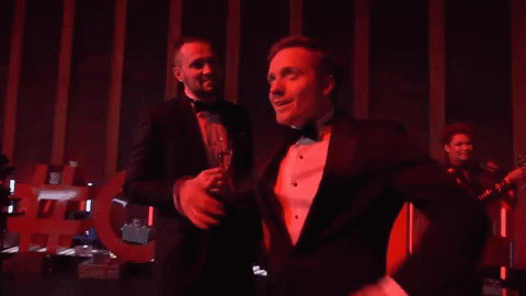 Виктор в смокинге танцует и поправляет бабочку на вечеринке Студии Союз, окруженный гостями.