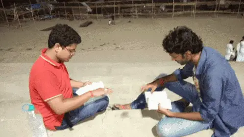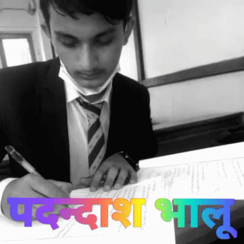 Padandas Bhalu, a young man in a suit, diligently writes on paper, focusing on his studies.
