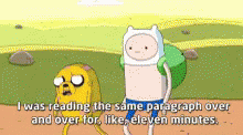Finn from Adventure Time recounts reading the same paragraph repeatedly to Jake.