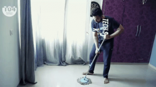 Mukul Sharma (Stufflistings) tiredly mops the floor after tech work, showing a relatable daily chore.
