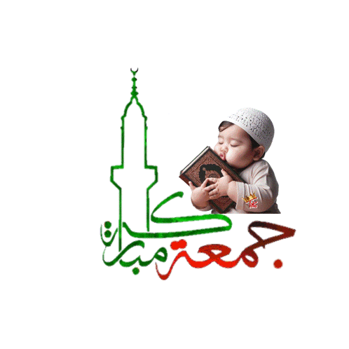 Cute baby holding a Quran, with a mosque outline and 'Jummah Mubarak' greeting. From Tawfikiya.