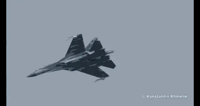 A powerful Su35 fighter jet performs an impressive aerial maneuver against a cloudy sky.