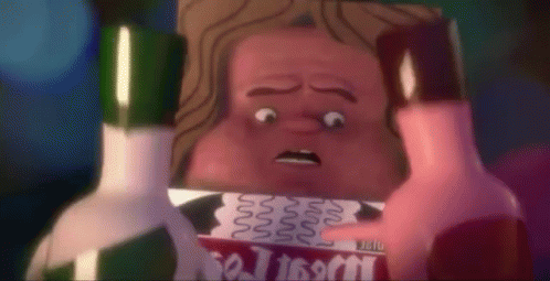 Cartoon characters from Sausage Party, including a box of spaghetti, are shown with exaggerated expressions in a party setting.
