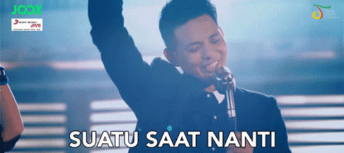 A man from Gamma1 performs the song 'Suatu Saat Nanti Esok' on stage, with lyrics displayed.