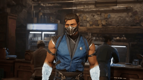 Sub Zero from Mortal Kombat 1 stands in a dimly lit room, wearing his iconic blue and black outfit.