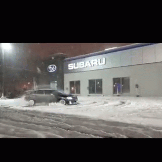 A Subaru WRX STI performs impressive snow donuts in front of a Subaru dealership during a snowfall.