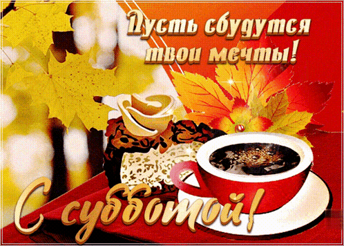 A cozy image featuring a red coffee cup, cake, and autumn leaves, with a Russian greeting for 'Happy Saturday' and 'May your dreams come true!'