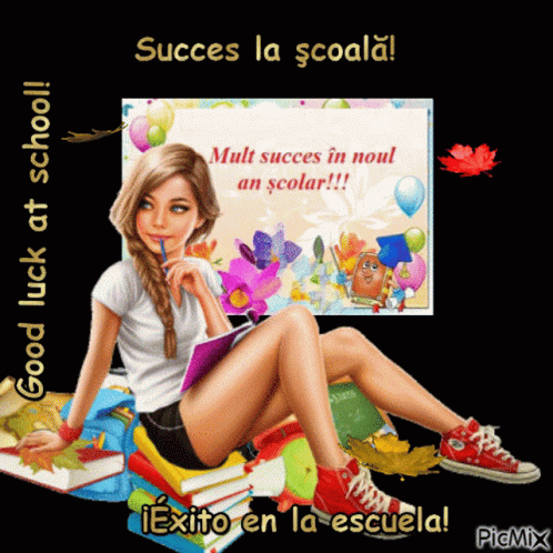 An animated image of a girl sitting on books, wishing 'Good luck at school!' in multiple languages.