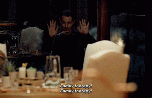 Kendall Roy from HBO's Succession emphatically declares 'Family therapy!' at a dinner table.