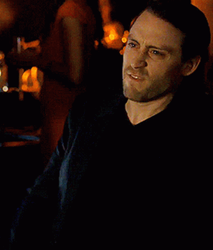 Roman Roy from Succession makes an intense, funny face, clenching his fists in a dimly lit setting.