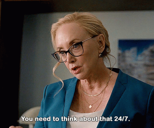 Gerri Kellman from Succession, wearing a blue suit and glasses, emphasizes the need to think 24/7.