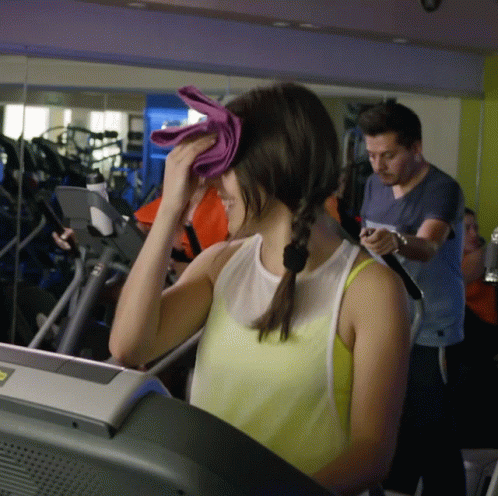 A woman smiles and wipes sweat with a pink towel during a happy workout at the gym, enjoying her fitness routine.