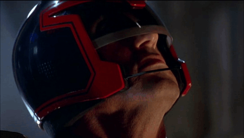 Sylvester Stallone as Judge Dredd delivers his iconic line 'I am the Law!' in a close-up shot.