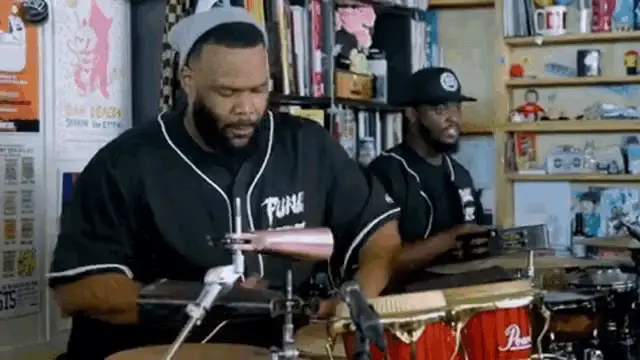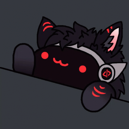 Sudo Protogen, an animated black cat with red eyes and headphones, playing bongo drums.