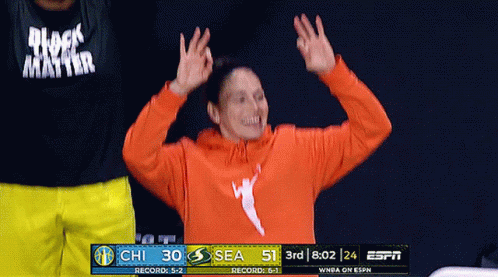 Sue Bird of the Seattle Storm, wearing an orange hoodie, smiles and claps enthusiastically during a WNBA game, with Breanna Stewart's stats shown.