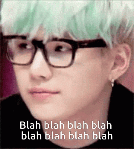 BTS's Suga, wearing glasses, looks unimpressed as 'Blah blah blah' text appears, conveying boredom.