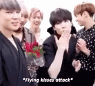 Suga (Min Yoongi) of BTS sends flying kisses to the camera, joined by other members.