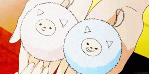 Hands hold two adorable fluffy keychains from the anime Sukkitte Ii Na Yo: Say I Love You.