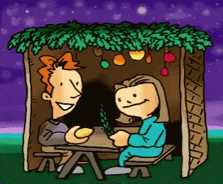 Cartoon depicting a man and a woman celebrating the Jewish holiday of Sukkot under a Sukkah.