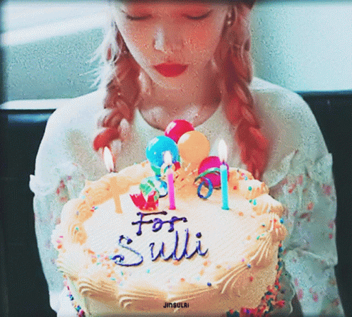 Sulli (Choi Jinri) blows out candles on a birthday cake, celebrating with a cake that says 'For Sulli'.