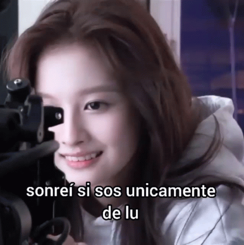 Sullyoon from Nmixx smiles sweetly, with Spanish text 'smile if you are only Lu's' overlaid.