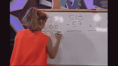 A young girl in an orange shirt solves addition, subtraction, and multiplication problems on a whiteboard.