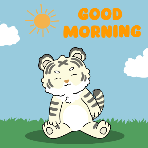 A cute cartoon tiger transitions from a sunny 'Good Morning' scene to sleeping peacefully under the moon at night.
