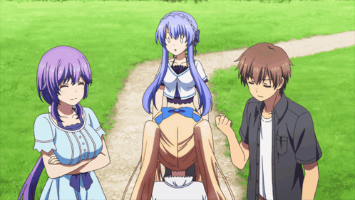 Shizuku Mizuori from Summer Pockets reacts emotionally with other characters in a grassy outdoor setting.