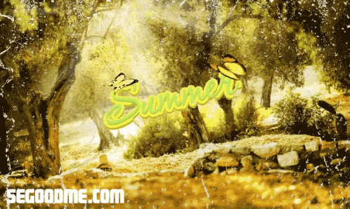 Vibrant animated forest scene with sunlight, butterflies, and the word 'Summer' prominently displayed.