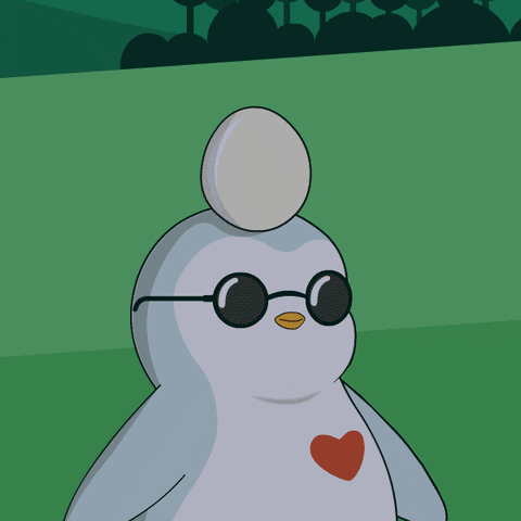 A cute pudgy penguin with an egg on its head transforms it into a bright sun, greeting the morning with 'GOOD MORNING!' message.