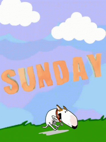 A cheerful cartoon dog runs on green grass under a sky with clouds, as the word 'SUNDAY' rotates above.