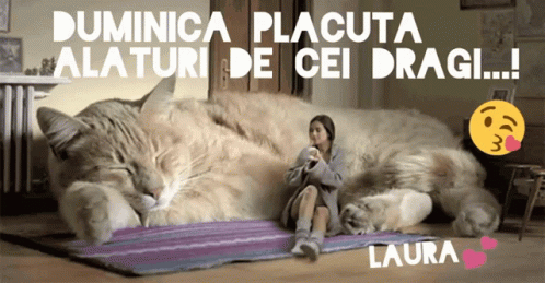 Laura enjoys a pleasant Sunday with a giant sleeping cat, a cozy scene for loved ones.