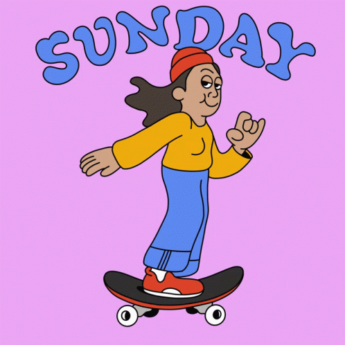 Cartoon of a Latinx woman skateboarding on a happy Sunday, making a rock on gesture.