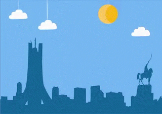 A cartoon sheep floats in the sky above a city skyline, wishing 'Eid al-Adha Mubarak'.