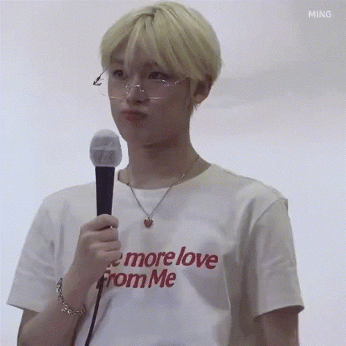 Enhypen's Sunoo makes a cute pouting face while holding a microphone, wearing glasses and a white t-shirt.