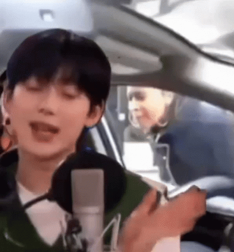 Sunoo, also known as cheeknoo, sings into a microphone inside a car, creating a popular Sunoo Meme.