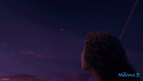 Moana looks out at a vibrant sunset over the ocean, with birds flying in the sky, from Moana 2.