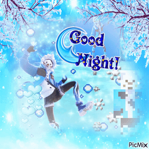 A winter-themed 'Good Night!' message featuring a Fortnite-like character, with Sunspot Cold Fusion.