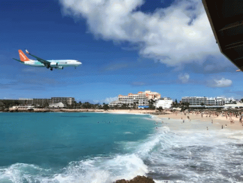 A Sunwing Airlines plane makes a dramatic low approach over Maho Beach in Sint Maarten, thrilling beachgoers.