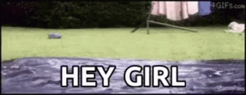 A large man slides on a backyard slip-n-slide with the caption "HEY GIRL" appearing on screen.
