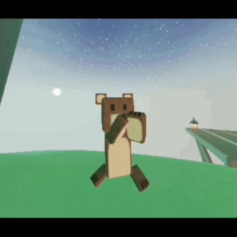 A blocky Super Bear character performs a lively dance in a low-poly video game world.