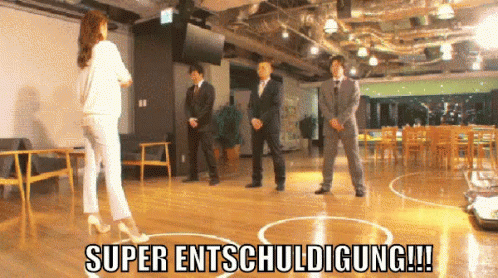 A group of men in suits perform an exaggerated, extreme apology, bowing deeply and prostrating themselves on the floor.