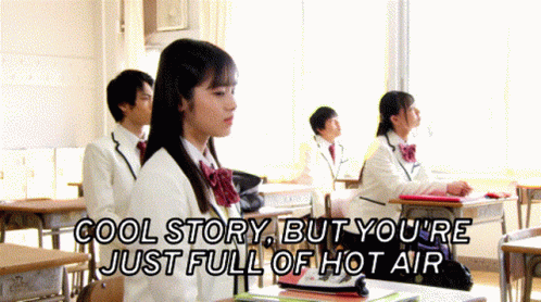 Haruka Kitou in a Super Sentai Donbrothers classroom, reacting to 'Cool story, but you're just full of hot air'.