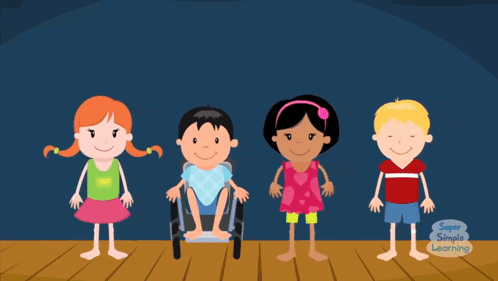 Animated children from Super Simple Songs perform various actions, demonstrating movements for young learners.
