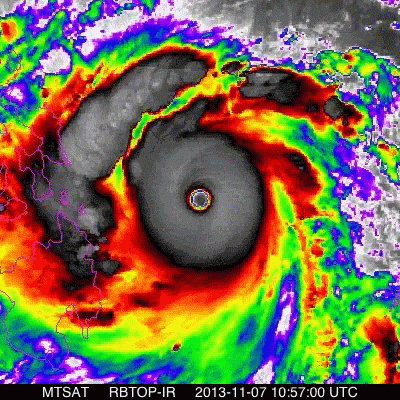 Satellite infrared imagery captures the powerful Super Typhoon Haiyan on November 7-8, 2013, as it approaches the Philippines.