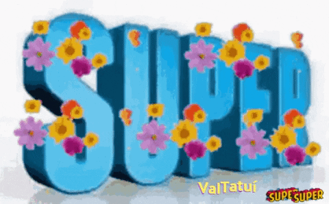 The word SUPER in blue 3D letters, adorned with colorful flowers, with 'ValTatui' and 'SUCSUPER' text.