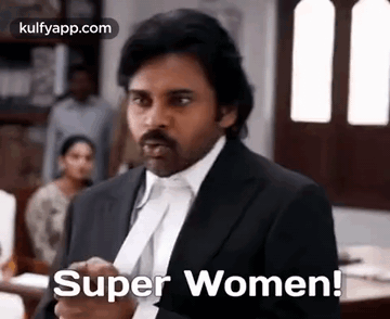 Pawan Kalyan, the Indian actor, delivers the powerful line 'Super Women!' in a courtroom scene.