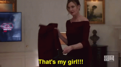 Brenda Strong as Lillian Luthor in Supergirl, saying 'That's my girl!!!' in a red dress.